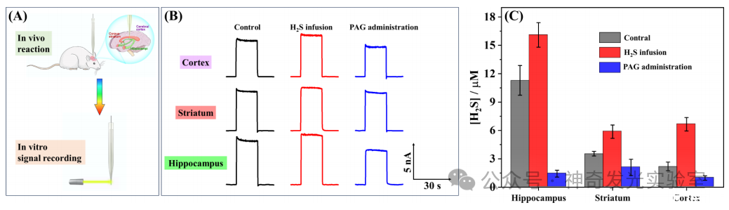 該體系中,微電極上的探針HSP可以與H2S特異性反應(yīng),促進(jìn)2,4-二硝基苯(DNP)醚基序的裂解,形成具有典型D-π-A光活性分子結(jié)構(gòu)的光敏劑,從而顯著提高光電流響應(yīng)。這種PEC微電極對(duì)硫化氫表現(xiàn)出快速、特異性的反應(yīng),并能在生理pH條件下的水緩沖液和人工腦脊液中對(duì)H2S表現(xiàn)出有效的反應(yīng)。隨后,我們使用PEC微電極檢測(cè)了正常活小鼠大腦不同區(qū)域(海馬、紋狀體、大腦皮層)的H2S水平,并驗(yàn)證了硫化氫在藥理調(diào)節(jié)作用下的腦H2S水平的變化。所有的體內(nèi)實(shí)驗(yàn)結(jié)果都表明,該傳感器能有效地檢測(cè)活腦中的H2S。因此,本研究不僅為體內(nèi)精確定量的H2S提供了有效的工具,也為其他重要生物分子PEC傳感器的開(kāi)發(fā)提供了參考范例。