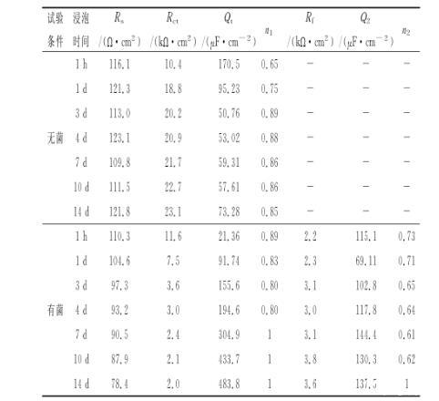 由圖2可見(jiàn),在無(wú)菌介質(zhì)中,黃銅電極的阻抗值隨著浸泡時(shí)間的延長(zhǎng)而增大,而在含菌介質(zhì)中,電極阻抗值則隨著浸泡時(shí)間的延長(zhǎng)而顯著減小。可用圖3(a)和(b)的等效電路分別來(lái)擬合圖2中無(wú)菌和含菌體系中電極的電化學(xué)阻抗譜。其中,Rct為電極表面反應(yīng)的電荷轉(zhuǎn)移電阻,Qt為金屬/介質(zhì)表面的雙電層電容,Rf為膜層電阻,Q2為膜層電容。采用Zview軟件進(jìn)行擬合,結(jié)果如表1所示。