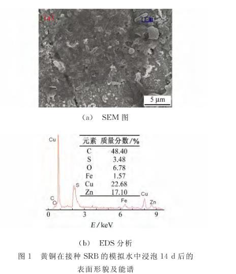 將黃銅掛片浸泡在含菌溶液中14 d,可以發(fā)現(xiàn)掛片表面逐漸被微生物膜所覆蓋。圖1為黃銅試樣在接種SRB的模擬水中浸泡14 d后的表面形貌及EDS能譜分析結(jié)果。由圖1(a)可見(jiàn),試驗(yàn)所用的脫硫弧菌為2~6μm的略微彎曲的圓筒狀菌,被胞外聚合物以及腐蝕產(chǎn)物包裹附著在金屬表面形成疏松多孔的微生物膜和腐蝕產(chǎn)物膜。