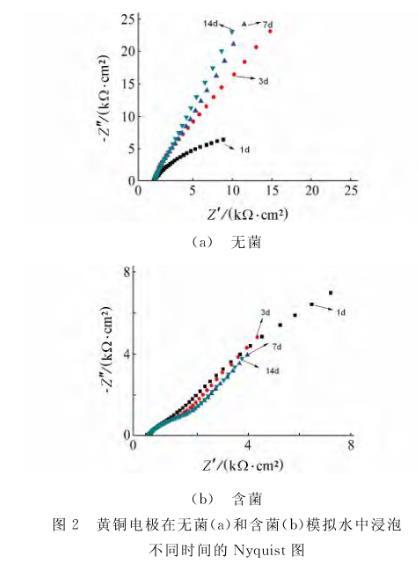 圖2黃銅電極在無(wú)菌(a)和含菌(b)模擬水中浸泡不同時(shí)間的Nyquist圖