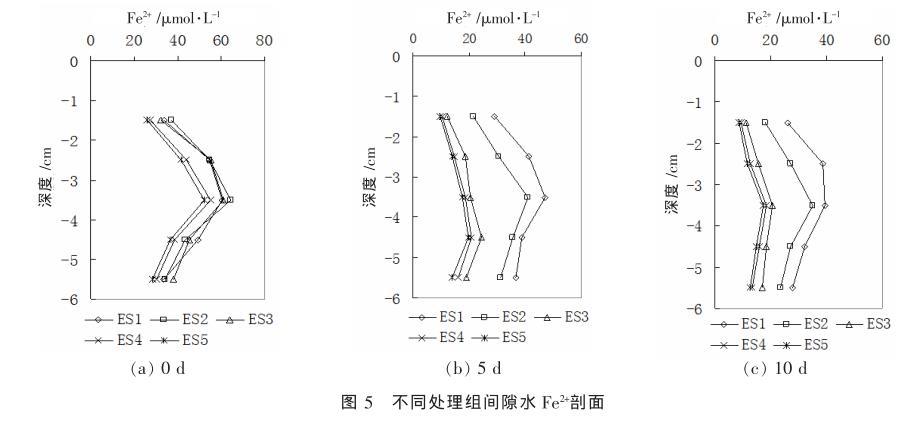 各處理組沉積物微環(huán)境Fe2+剖面見圖5。