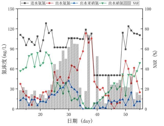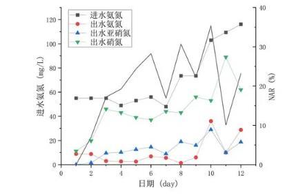 (1)反應器啟動。亞硝化反應器接種了實驗室培養成熟的硝化污泥后,向反應器內配置了50mg/L氨氮內循環悶曝3天時間,出水硝氮迅速升高,表現出了良好的硝化活性(圖1),第4天開啟連續流進水,通過提高進水濃度與縮短停留時間的方法提高硝化負荷。第10天后,進水固定為100mg/L,停留時間固定6h,系統的氨氮去除率也達到了90%,但NAR依然保持30%的范圍浮動,這也說明了,中低氨氮濃度進水情況下普通的硝化反應器無法實現亞硝化。