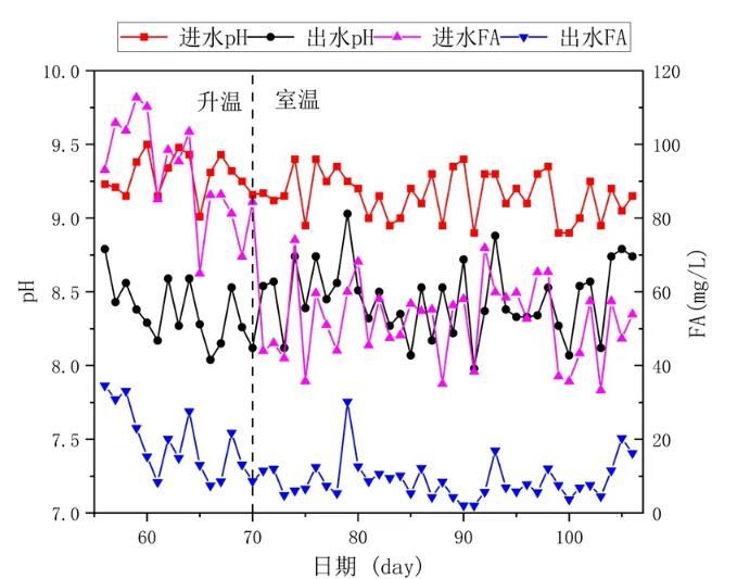 圖5升溫后亞硝化反應器pH與FA濃度變化
