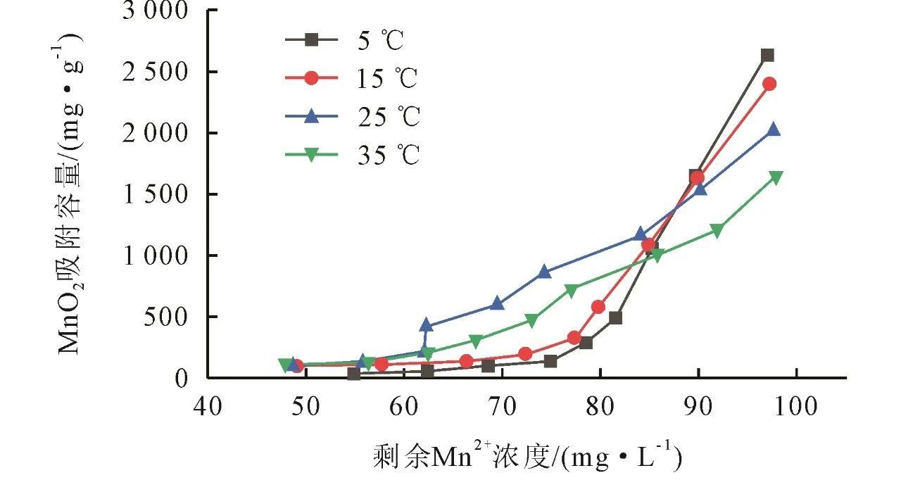 原位生成不同濃度的MnO2分別在5、15、25、35℃下靜態(tài)吸附等溫圖如圖5所示。低溫有利于低濃度MnO2吸附,5℃下濃度為1 mg/L的MnO2吸附容量能達(dá)到2638.38 mg/g,但不利于高濃度MnO2吸附。低濃度MnO2比表面積大,吸附位點多,主要依靠物理吸附,物理吸附通常是放熱過程,即吸附反應(yīng)釋放熱量,故低溫下低濃度MnO2吸附容量更大。相反,高濃度的MnO2吸附反應(yīng)由于溫度較低而受到熱力學(xué)不利因素的影響。