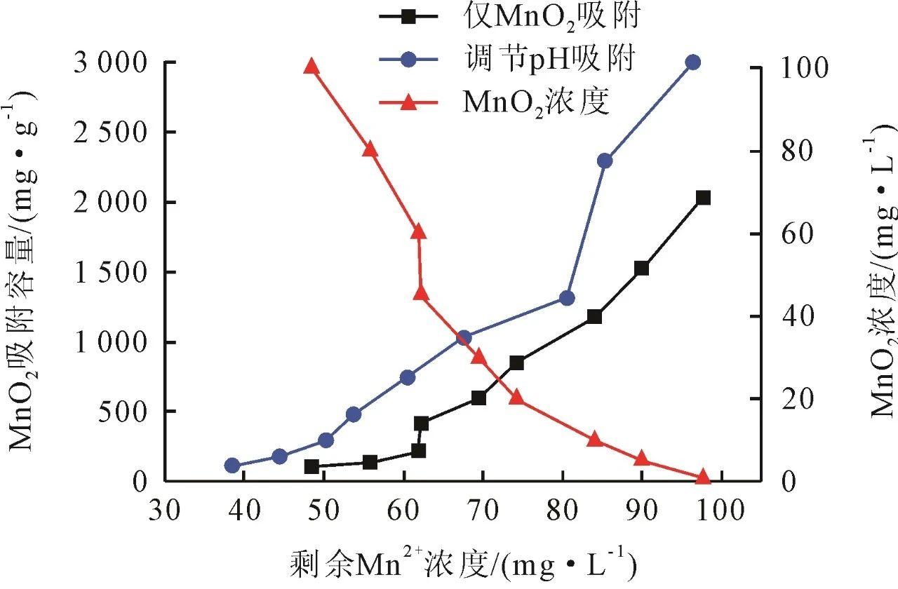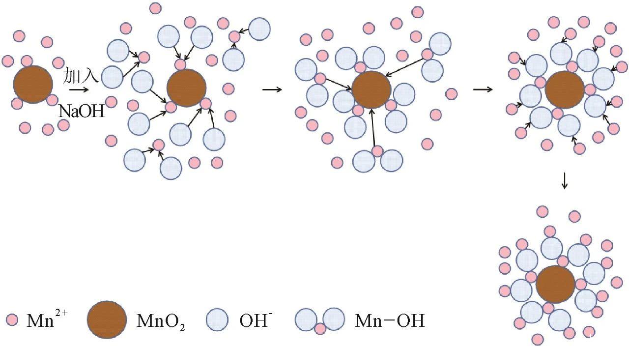 加入NaOH能顯著提高M(jìn)nO2的吸附容量。分析認(rèn)為,OH?離子能夠促使MnO2表面上Mn—OH基團(tuán)的形成,這些基團(tuán)能夠吸附Mn2+離子,從而提升了MnO2對Mn2+離子的吸附能力。同時OH?離子還可以中和MnO2表面的正電荷密度,從而降低了電荷排斥效應(yīng),使得MnO2表面更容易吸附帶正電的MnO2離子(圖2)。
