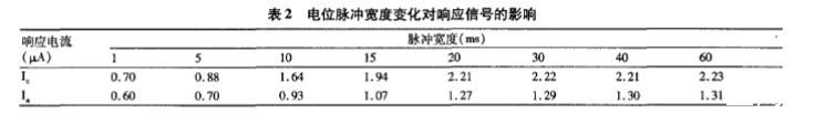 表1界面充電電流(I)隨采樣時間的變化2.3電位脈沖寬度對暫態響應信號的影響從表2中可以看出,當電位脈沖寬度增加時,所對應的還原電流(I。)和氧化電流(I)也在逐漸增加,20ms之前變化明顯,之后漸趨穩定。這是因為在單個脈沖寬度內,當采樣時間一定時,增加脈沖寬度,實際上會延長反應的持續時間,使參加反應的物質量上升,生成量增加,反應電流隨之增加。當電位脈沖寬度增加到一定時間時,反應達到平衡,屆時還原電流(I)和氧化電流(I)漸趨穩定。因此,適當地延長電位脈沖寬度可使靈敏度提高,但并不是越長越好,時間長了,檢測速度就會受到限制。