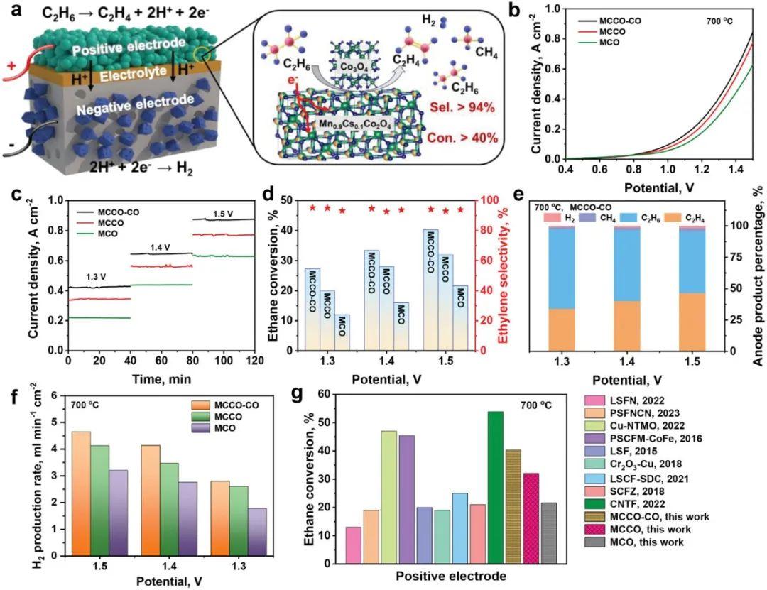 圖4 MCCO-CO電池用于乙烷非氧化脫氫的性能。a)PCEC中乙烷轉化為乙烯的示意圖。b)700°C下MCO、MCCO和MCCO-CO電極用于EDH的I-V曲線。c)1.3-1.5V下使用MCO、MCCO和MCCO-CO電極進行乙烷非氧化脫氫的短期穩定性。d)1.3-1.5V下的乙烷轉化率和乙烯選擇性。e)700°C下使用MCCO-CO電極進行乙烷電化學非氧化脫氫的產物分析。f)1.3-1.5 V下EDH過程中具有不同尖晶石氧電極的電池的H2生成速率。g)MCCO-CO與其他最近報道的電極中乙烷轉化率的比較。
