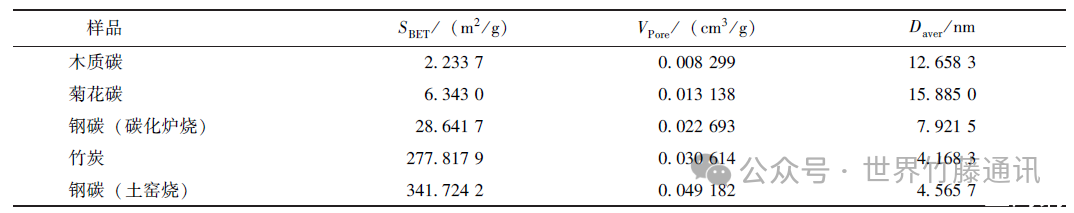 5種碳材料的N2吸附曲線圖和孔徑分布圖見圖2。可以看出,在吸附時,隨著相對壓力(P/P0)的逐漸增大,吸附量呈上升趨勢;而當脫附時,隨著相對壓力從1.0逐漸減小至0.0,微孔中吸附的氣體開始逐漸釋放,導致脫附曲線呈現下降趨勢。并且竹炭、鋼炭(土窯燒)的磁滯回線保持開放狀態,這歸因于微孔的存在,相應的孔徑分布驗證了這一點(圖2b)。