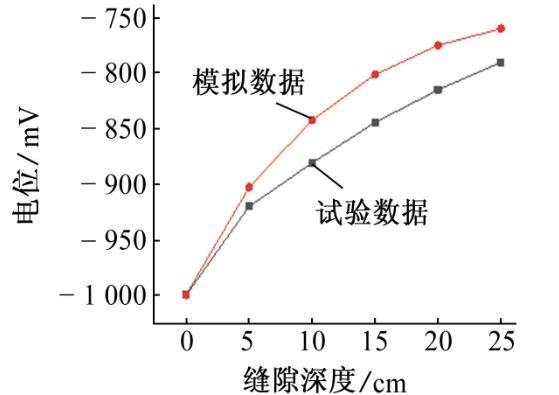 圖9 72 h后模擬和試驗所得的縫內(nèi)電位