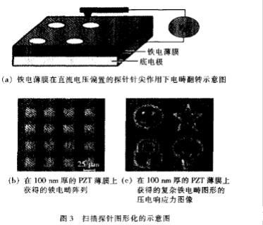 第二種表面極化圖形化的方法是把電極的概念擴展到掃描探針針尖。如圖3(a)所示,導電的掃描探針顯微鏡(SPM)針尖掃描鐵電表面時,施加直流電壓。當針尖引起的局域電場足夠高時,與針尖接觸的區域內的鐵電疇取向發生翻轉。通過控制針尖的運動,形成復雜鐵電疇圖形,并且由于針尖半徑非常小(約10nm),因此可獲得的鐵電疇圖形具有極高的空間分辨率。鐵電疇翻轉機制也包括新疇成核,然后是前向生長和側向擴展過程。(a)鐵電薄膜在直流電壓偏置的探針針尖作用下電疇翻轉示意圖一■(b)在100nm厚的PzT薄膜上(e)在100nln厚的PZT薄膜上獲得的鐵電疇陣列獲得的復雜鐵電疇圖形的壓電響應力圖像