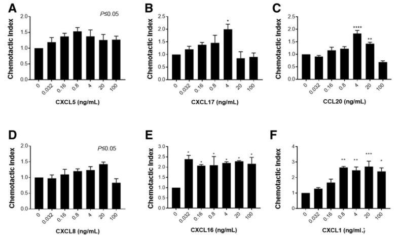 圖5、MoDCs對胃上皮釋放的多種趨化因子具有趨化活性。Transwell趨化試驗分析了MoDCs對不同濃度的(A)CXCL5、(B)CXCL17、(C)CCL20、(D)CXCL8、(E)CXCL16和(F)CXCL1的趨化活性。圖中顯示了3個或更多實驗的代表性結(jié)果。一式三孔的平均值±SD,采用單因素方差分析。