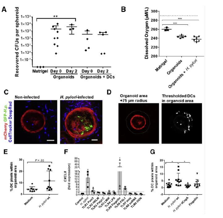 圖3、幽門螺桿菌感染人胃上皮細胞球?qū)е翫C募集增加。(A)從單獨的Matrigel或幽門螺桿菌感染的胃球形培養(yǎng)物(20-50個/培養(yǎng)物)(有或沒有共培養(yǎng)的MoDCs)中回收細菌。(B)微電極分析胃球體內(nèi)測得的管腔氧濃度(n=5或6個有機體,均數(shù)±標準差)。虛線表示緩沖液中的氧氣濃度。(C)未感染和感染GFP-幽門螺桿菌(綠色)、表達mCherry的胃球形體(紅色)與CellTracker標記的MoDCs(藍色)共培養(yǎng)48小時的代表性共聚焦圖像(單個光學切片)。(E)對3個獨立實驗中8個未感染和9個感染了GFP-幽門螺桿菌的球狀體共培養(yǎng)物的數(shù)字圖像分析。圖中顯示了單個數(shù)據(jù)點的平均值±SD。(F)將胃上皮球形細胞復制為單層細胞,并用幽門螺桿菌60190野生型(wt,5×107個/孔)或一系列TLR激動劑(見“材料與方法”部分)處理6小時。(G)胃球體微注射單獨的FITC右旋糖酐(分子量4千道爾頓,示蹤劑)或含有幽門螺桿菌60190野生型、幽門螺桿菌60190ΔCagA或沙門氏菌鞭毛蛋白(1μg/ml)的FITC右旋糖酐。