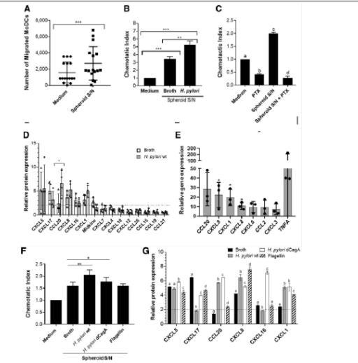 圖4、幽門螺桿菌感染會增加人胃上皮細胞趨化因子的表達,導致直流電募集增強。(A)在Transwell趨化試驗中,檢測從已建立的球形培養(yǎng)物中收集48小時以上的培養(yǎng)上清(S/Ns)吸引MoDCs(2×105個/孔)的能力。(B)從感染或未感染幽門螺桿菌的胃小球中收集的培養(yǎng)上清液在小球顯微注射48小時后與MoDCs(1×105個/孔)一起在Transwell趨化試驗中進行分析。(C)分析了MoDC在存在或不存在百日咳毒素(PTX,10μg/mL)的情況下對單獨培養(yǎng)基或胃球上清的趨化性。圖中顯示的是一式三孔的平均值±SD,3個實驗中有1個具有代表性。(D)利用趨化因子陣列分析從感染幽門螺桿菌和未感染幽門螺桿菌(48小時)的球形培養(yǎng)物中收集的上清液中是否存在趨化因子。(E)幽門螺桿菌感染球體與非感染球體中部分趨化因子和細胞因子基因的相對基因表達。(F)48小時后,收集胃球微注射肉湯、幽門螺桿菌野生型(wt)、幽門螺桿菌ΔCagA或沙門氏菌鞭毛蛋白的培養(yǎng)上清。(G)用趨化因子陣列分析不同處理的球形培養(yǎng)物上清液中是否存在趨化因子。