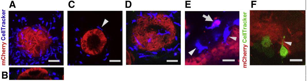 圖2、MoDCs直接與共培養(yǎng)的胃球上皮細胞結(jié)合。將細胞追蹤器標記的MoDCs加入表達mCherry的胃球形細胞培養(yǎng)物中。48小時后,在Leica SP5激光共聚焦掃描顯微鏡上使用63×水浸物鏡對培養(yǎng)物進行固定和成像。(A-C)遷移到胃上皮球體(紅色)基外側(cè)的細胞追蹤DeepRed標記MoDCs(藍色)。比例尺:50μm。(A)XY圖像,57個單獨圖像的最大Z投影,步長為1μm。(B)同一球體的XZ投影。(C)單張XY切片顯示了直流電(箭頭)與球面之間的物理聯(lián)系。(D)6個相鄰切片的Z向投影顯示胃球表面廣泛的樹突形成。(E)高分辨率圖像顯示,CellTracker DeepRed標記的MoDCs(藍色)與胃上皮細胞(箭頭)直接接觸,1個MoDC內(nèi)含mCherry+胃上皮細胞物質(zhì)(合并圖像中為粉紅色;箭頭)。(F)細胞追蹤綠標記的MoDC(綠色)將樹突(箭頭)延伸至上皮細胞層(紅色)。