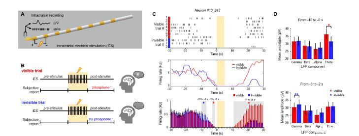 圖2.臨界閾值顱內電刺激實驗結果。(A)臨界閾值顱內電刺激范式示意圖。研究團隊通過給微電極臨近的宏電極對施加臨界光幻視強度電刺激,同時記錄患者主觀報告的行為結果和微電極的場電位和動作電位活動;(B)可見試次和不可見電刺激試次圖示。透明黃色區域表示iES的時間段;(C)V1神經元在光幻視可見試次和不可見試次中的動作電位發放差異;(D)V1不同頻段場電位在光幻視可見試次和不可見試次中的強度差異。