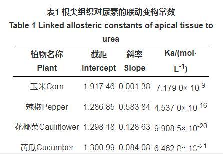 由上述方程分別計算得出4種植物的根尖分生組織對尿素的聯(lián)動變構常數(shù)Ka,如表1所示。
