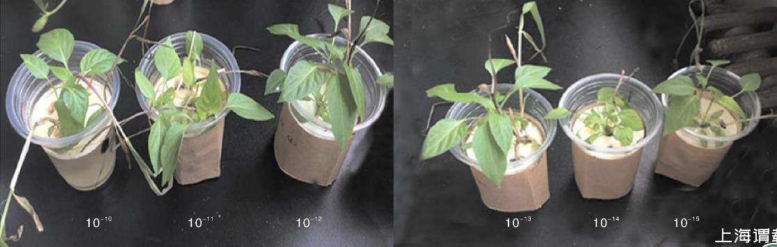 圖7玉米和辣椒在從左至右10-10~10-15mol·L-1的尿素溶液中培養(yǎng)