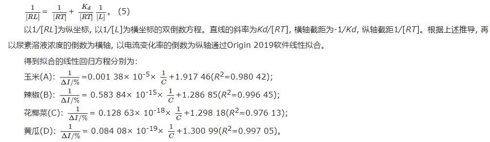 以1/[RL]為縱坐標,以1/[L]為橫坐標的雙倒數(shù)方程。直線的斜率為Kd/[RT],橫軸截距為-1/Kd,縱軸截距1/[RT]。根據(jù)上述推導,再以尿素溶液濃度的倒數(shù)為橫軸,以電流變化率的倒數(shù)為縱軸通過Origin 2019軟件線性擬合。