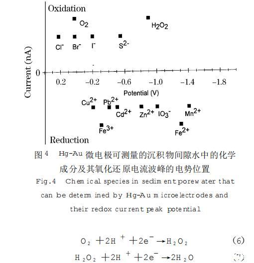 圖4 Hg-Au微電極可測量的沉積物間隙水中的化學成分及其氧化還原電流波峰的電勢位置