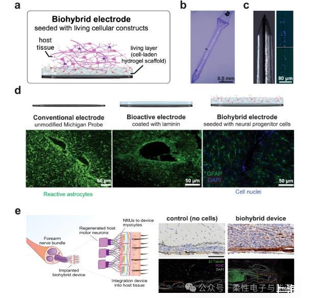 將組織工程與生物電子學(xué)結(jié)合,通過構(gòu)建集成宿主細(xì)胞的生物平臺可顯著提升神經(jīng)界面的生物相容性與長期整合性。早期生物混合策略聚焦于活細(xì)胞與電子器件的直接結(jié)合,例如1988年采用中空玻璃錐包裹金線并嵌入坐骨神經(jīng)片段的“錐形電極”,其通過促進(jìn)神經(jīng)突起長入電極實現(xiàn)長達(dá)15個月的穩(wěn)定記錄,且后續(xù)人體臨床試驗顯示植入13年后電極尖端仍存在神經(jīng)生長而無膠質(zhì)瘢痕,證明細(xì)胞整合系統(tǒng)的優(yōu)越性遠(yuǎn)超單純生物分子涂層。2002年開發(fā)的“篩電極”首次將軸突生長容器與微電極結(jié)合,利用生物混合裝置中的軸突作為電極與肌肉間的信號中繼,實現(xiàn)了周圍神經(jīng)損傷后肌肉控制的恢復(fù)。近年來,該領(lǐng)域進(jìn)一步拓展為兩大方向:一是通過細(xì)胞外基質(zhì)(ECM)衍生生物分子修飾電極以增強細(xì)胞黏附,二是構(gòu)建功能性載細(xì)胞水凝膠支架,例如在導(dǎo)電聚合物纖維表面直接培養(yǎng)神經(jīng)元并覆蓋瓊脂糖層固定網(wǎng)絡(luò),形成機械順應(yīng)性電極陣列;或在柔性微電極陣列上鋪展工程化軸突束,嵌入瓊脂糖基質(zhì)后植入神經(jīng)導(dǎo)管,實驗顯示植入體內(nèi)2周即可誘導(dǎo)宿主軸突再生與血管化,為神經(jīng)修復(fù)提供新路徑。