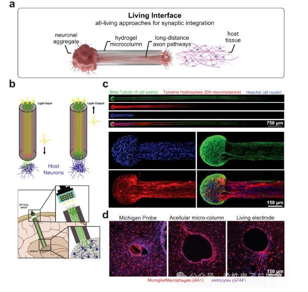 近年來,活體電極的概念在神經(jīng)系統(tǒng)疾病治療中得到了廣泛應(yīng)用,其中微組織工程神經(jīng)網(wǎng)絡(luò)(μTENNs)作為一種仿生長距離神經(jīng)元通路的制造方法,自十年前首次引入以來,逐漸成為研究熱點。μTENNs由一個水凝膠微柱構(gòu)成,微柱上接種的神經(jīng)元群體通過微柱內(nèi)腔生長出長突軸突,形成基于軸突的活電極,作為與神經(jīng)系統(tǒng)通信的平臺技術(shù),用于恢復(fù)損傷或神經(jīng)變性后失去的功能。盡管大多數(shù)研究集中在單個μTENNs的應(yīng)用,但通過嵌套μTENNs,還可以構(gòu)建3D多細(xì)胞生物電路。例如,背根神經(jīng)節(jié)感覺神經(jīng)元(DRG-SN)的雙向軸突生長能夠支配皮質(zhì)神經(jīng)元和心肌細(xì)胞,展示了全生物神經(jīng)調(diào)節(jié)生物回路的可行性。此外,鈣熒光成像技術(shù)被用于評估3D組織工程軸突束的功能連接,進(jìn)一步凸顯了這些結(jié)構(gòu)作為神經(jīng)研究生理相關(guān)體外平臺的潛力。