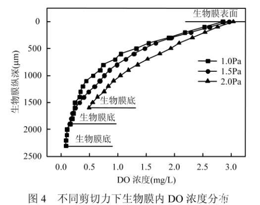 從圖4中可以看出,隨著生物膜深度的增加,DO濃度逐漸減小。1.0Pa條件下,DO從生物膜表面處的2.85mg/L降低到底部的0.08mg/L,上部為好氧環境,中間為缺氧環境,到底部逐漸趨近于厭氧環境,這為同步硝化反硝化的反生提供了有利的條件。1.5Pa條件下,DO濃度從表面處的2.96mg/L降低到底部的0.15mg/L,上部仍然處于好氧環境,中間為缺氧環境,到底部逐步趨近于厭氧環境,此條件下DO濃度比1.0Pa條件下DO濃度略高。2.0Pa條件下,DO濃度由3.04mg/L降低到0.49mg/L,含量是3種剪切力條件下最高的,整個生物膜內均為好氧環境。從圖4可以明顯的看出,剪切力越大,生物膜內部的DO濃度是越高的,這是因為剪切力越大,水流的紊動性越強,越有利于DO從水相傳質到生物膜表面。