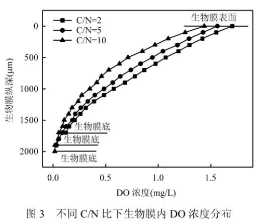 從圖3中可以看出,隨著生物膜深度的增加,DO濃度逐漸減小。C/N比為2時,DO從生物膜表面處的1.70mg/L降低到底部的0.12mg/L,生物膜縱深0——1.1μm范圍內為好氧環境,1.1——1.7μm范圍內為缺氧環境,這為同步硝化反硝化的反生提供了有利的條件。C/N比為5時,DO濃度從表面處的1.56mg/L降低到底部的0.03mg/L,生物膜縱深0——1.0μm范圍內仍然處于好氧環境,中間1.0——1.5μm范圍內為缺氧環境,1.5——1.9μm范圍內為厭氧環境,此條件下DO濃度比C/N=2時DO濃度略低。C/N=10條件下,DO濃度由1.44mg/L降低到0.02mg/L,含量是3種C/N比條件下最低的。從圖3中可以明顯的看出,C/N比越大,生物膜內部的DO濃度越低,這是因為COD濃度越高,營養物越充分,越有利于微生物的生長,消耗的DO就會越多,此外,較厚的生物膜是不利于DO從水相到生物膜內的傳質過程的,其內部的DO自然就較低。