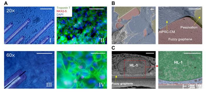 圖2.3DFG MEA-心肌細胞界面。(A)在3DFG-MEAs上培養7天的hiPSC-CMs的明場(I和III)和免疫熒光圖像(II和IV)。比例尺,100微米(I和II)和50微米(III和IV)。(B)hiPSC-CMs在3DFG MEAs上的偽彩色掃描電子顯微鏡圖像。比例尺,5微米。(C)HL-1細胞在3DFG上的橫截面掃描電子顯微鏡圖像。右側圖像顯示細胞核為綠色,細胞質為藍色,3DFG為紅色。比例尺,2微米。