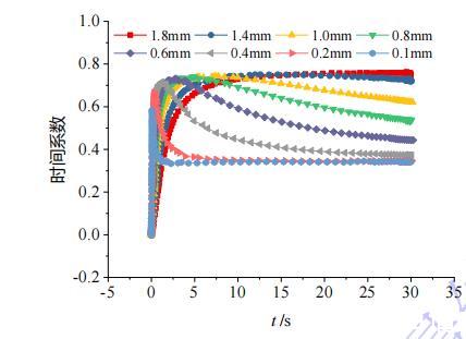 圖5不同反應區域時氣泡的生長直徑,(a)氣泡的直徑隨時間的變化,(b)30s時的直徑由于氣泡的直徑與生長時間滿足冪律關系,因此,時間系數可以通過以下微分求得,圖6給出了由公式(13)給出的不同反應區域下生長的氣泡的時間系數。通過前面的分析可知,在氣泡生長的慣性控制階段,時間系數為0.66~1.00。然而對于慣性控制階段的直徑變化,模擬呈現的并不準確。但由于這一階段氣泡的生長時間不超過0.1 s,對于氣泡后續的生長影響并不大。時間系數從0.56降低到0.33的時間段是由擴散控制向化學反應控制過渡階段。