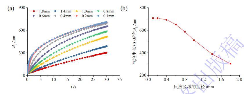 設置不同的反應區域,得到的氣泡直徑的曲線如圖5所示。較小的反應區域引起了更大的氣泡直徑。當反應區域直徑超過0.4 mm時,生長了30 s的氣泡直徑近似隨著反應區域增加近似線性減小。在氣泡生長早期,反應區域越小,氣泡生長速率越快。另外,相比于反應區域的直徑為0.1 mm,0.4 mm時的氣泡直徑一開始雖然明顯小于0.1 mm的情況,但在30 s時氣泡生長直徑已經與反應區域直徑為0.1 mm的情況接近。盡管反應區域直徑為0.1 mm和直徑為0.2 mm的電極反應面積相差4倍,但氣泡生長曲線差別非常小。在我們先前針對激光光斑尺寸的研究中,光斑尺寸相差68%,氣泡生長曲線的差異也不大。這是因為氣泡能夠迅速生長,進而超出電極表面的反應區域。