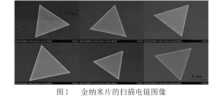 金納米片的形貌決定著它的性質和應用。如圖1所示,就是使用上述方法合成的金納米片的典型的掃描電鏡圖像。在此金納米片的產物中正三角形納米片占據了絕大多數,還有極少量六邊形納米片。其次,此方法合成的納米片尺寸較為均勻,主要分布在5μm~30μm之間,厚度約為幾十納米。