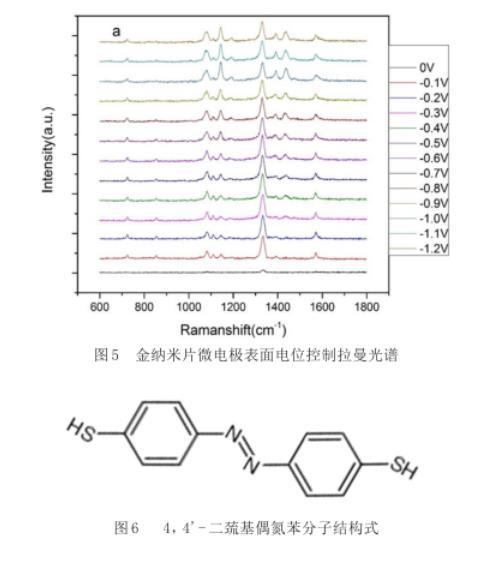 我們將濃度為0.01mol的4NTA分子溶液滴加在金納米片微電極表面,待干燥后進行變電位的拉曼光譜測量,電解液為Na2SO4溶液。在顯微共焦拉曼光譜儀(Renishaw InVia)的視野內選擇一片較大的金納米片,光斑集中在納米片的中央位置,然后均勻改變電極電位,同時測量不同電位下的拉曼光譜,如圖5。在本試驗的圖4(a)中我們發現模擬光譜和固體4NTA光譜中在714cm-1附近有一個非常微弱的峰,它表示S-CH3的振動,但是在隨電位連續變化的拉曼光譜中并未發現,這是由于4NTA分子在加電壓前就已經在液態環境中完成了脫甲基的過程,通過S-吸附在基底上。在0V一直降到-0.2V過程中,并沒有新的峰出現,說明此電位下并未發生化學反應,直到電位降到-0.3V時,才在1437cm-1處出現微弱的拉曼峰,而后隨著電壓的持續下降,這個峰也逐漸明顯。此處1437cm-1處的拉曼峰可歸屬于-N=N-雙鍵的伸縮振動模式。與此同時我們發現,在1338cm-1的峰也有明顯的減小,由此可知,在-0.3V時已經有少量4NTA分子的硝基開始脫氧,脫氧后的基團又倆倆合并成DMAB分子,如圖6。直到-1.2V時1338cm-1處的峰都沒有消失,說明樣品分子還沒有反應完全,可能與我們所用的激光波長和功率有關。