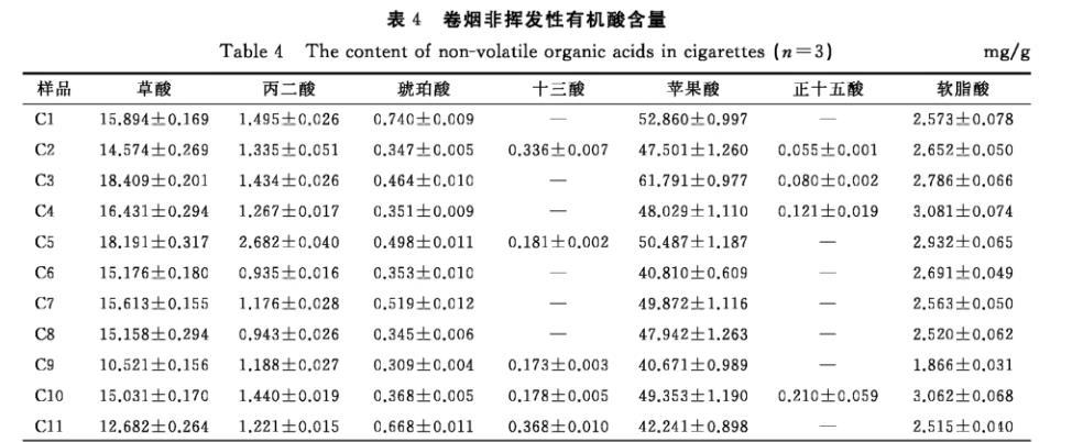 2.1.3樣品的測定卷煙非揮發性有機酸含量的測定結果見表4,單料煙非揮發性有機酸含量的測定結果見表5。