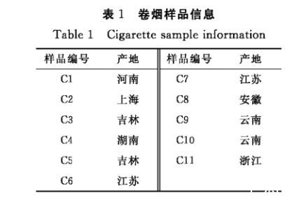 煙葉樣品:從中國貴州(T1~T4)、吉林(T5、T6)、山東(T7、T8)、福建(T9~T12)、河南(T13~T16)、湖南(T17~T21)、云南(T22~T27)代表性煙葉產區收集的上部、中部、下部烤煙煙葉以及巴西(T28、T29)、津巴布韋(T30、T31)、美國(T32~T34)煙葉樣品共34種;