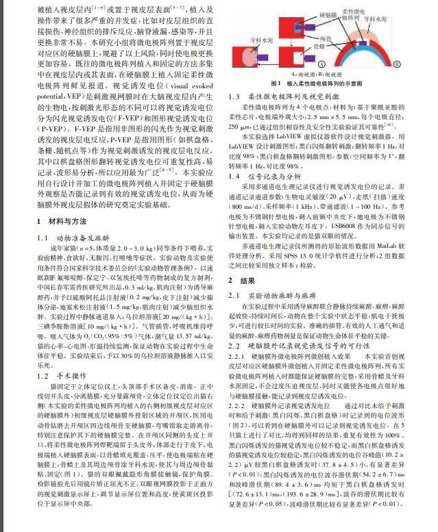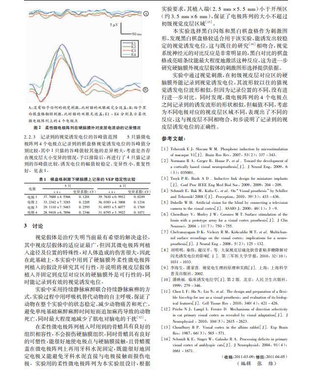 結論在視皮層定位區硬腦膜外首創的微創植入并固定柔性微電極陣列的方法適用性、重復性好,黑白棋盤格圖形刺激優于黑白閃爍刺激,經硬腦膜外利用微電極陣列記錄誘發電位是可行的。