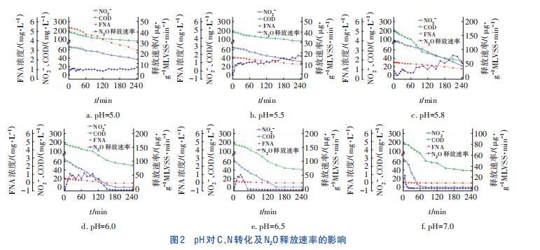 pH對C、N轉(zhuǎn)化及N2O釋放速率的影響如圖2所示。可以看出,在不同pH條件下,NO2-和COD濃度均隨時間的增加呈下降趨勢,但反硝化速率不同。當(dāng)pH為7.0時,60 min內(nèi)完成了NO2-的還原,但N2O的釋放主要發(fā)生在前30 min。隨著pH由5.8降至5.0,出水NO2-濃度呈升高趨勢。當(dāng)pH為5.0時,NO2-去除率僅為43.3%。不同pH條件下,N2O釋放呈現(xiàn)不同的特點。