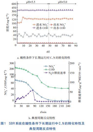 課題組前期馴化得到適應(yīng)酸性條件(pH=5.5)的NO2-型反硝化活性污泥,接種后再次降低進水pH至5.0并使其穩(wěn)定,研究酸性條件下NO2-型反硝化的運行特性,并在80 d時分析了SBR反應(yīng)器典型周期內(nèi)C、N轉(zhuǎn)化及N2O釋放特性,結(jié)果如圖1所示。由圖1(a)可以看出,NO2-型反硝化在酸性條件下運行穩(wěn)定。當(dāng)初始pH為5.0時,出水NO2--N濃度為0~0.8 mg/L,其去除率大于99%;出水COD為33~51 mg/L,其去除率為86.1%~90.9%。經(jīng)計算,去除的C/N在1.98~2.60之間。由圖1(b)可以看出,隨著反應(yīng)的進行,NO2-和COD均隨時間的增加呈降低趨勢。經(jīng)計算,NO2-的還原速率為10.88 mg/(gMLVSS·h),消耗的C/N為2.28。N2O的釋放主要發(fā)生在前90 min,最大釋放速率為58.27μg/(gMLVSS·min),有7.17%的NO2-轉(zhuǎn)化為N2O,釋放速率隨時間呈先升后降的趨勢。