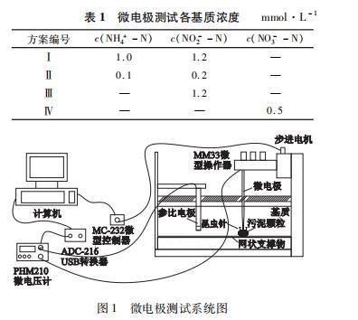 2)測試系統(tǒng)。試驗采用自制NH4+,NO3——,NO2——和pH等4種離子選擇性微電極,對污泥基團內部中氮素遷移轉化特征進行研究,制作方法參照國外相關制作方法。制作的微電極尖端直徑在25μm以內,響應時間≤2s,穩(wěn)定性較好,符合實際檢測應用所需標準。微電極測試線路如圖1所示。表1微電極測試各基質濃度圖1微電極測試系統(tǒng)圖從反應器進水端取出顆粒污泥置于測量室中,先用昆蟲針沿豎直方向插入顆粒污泥兩端,使其固定在致密的網(wǎng)狀支撐物上,預培養(yǎng)3h后進行測定。利用微調控器調節(jié),使得電極尖端處于顆粒表層以上300μm處開始測定,步長設為100μm.由于顆粒內部物質濃度呈對稱性分布特征,微電極測定時只檢測了顆粒污泥一半?yún)^(qū)域氮素的空間分布特征,以得到具有代表性的濃度分布變化。