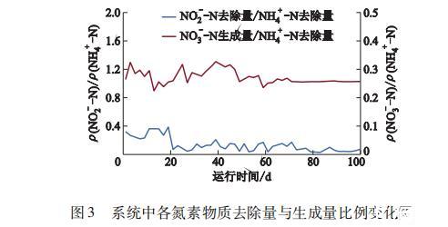 系統(tǒng)去除的亞硝酸鹽氮與氨氮的質(zhì)量濃度之比在1.00——1.25之間,同時系統(tǒng)生成的硝酸鹽氮與去除的氨氮質(zhì)量濃度之比在0.044上下波動(見圖3);這兩個比值均小于厭氧氨氧化反應化學計量式中的理論比值(式1)。據(jù)此推斷,系統(tǒng)中除厭氧氨氧化反應外,可能還存在反硝化反應,厭氧氨氧化過程中生成的部分副產(chǎn)物硝酸鹽氮發(fā)生了反硝化作用,轉(zhuǎn)化成為亞硝酸鹽氮或氮氣。
