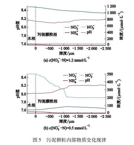 當基質(zhì)中只含有亞硝酸鹽氮時(見圖5a),亞硝酸鹽的濃度持續(xù)降低,氨氮和硝酸鹽氮的變化甚微,pH值略有增加,說明反硝化菌以亞硝酸鹽氮為電子受體發(fā)生了內(nèi)源反硝化反應;當基質(zhì)中只含硝酸鹽氮時(見圖5b),顆粒表層區(qū)域(0——1200μm),硝酸鹽濃度減少,亞硝酸鹽濃度略微增加,說明此段因缺乏氨氮和亞硝酸鹽氮致使厭氧氨氧化菌活性受到抑制,發(fā)生了將硝酸鹽氮還原為亞硝酸鹽氮的反硝化。顆粒污泥內(nèi)部1200μm到2500μm區(qū)域內(nèi),亞硝酸鹽氮濃度減小,硝酸鹽氮濃度變化甚微,說明發(fā)生了反硝化反應。