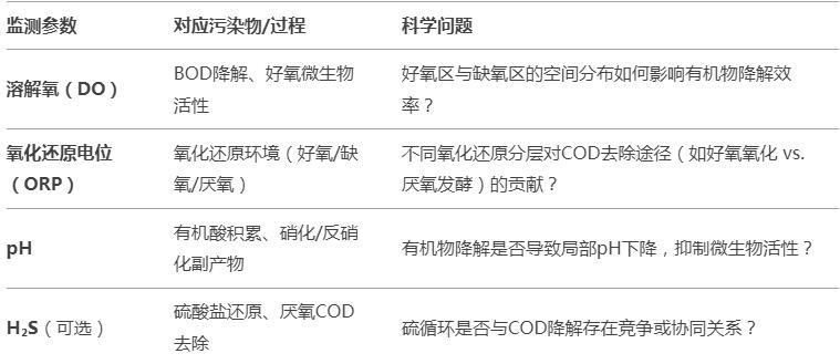 缺氧/厭氧貢獻:深層(>30 cm)ORP<-100 mV時,可能存在發酵或甲烷化途徑(COD降解但BOD檢測不到)。