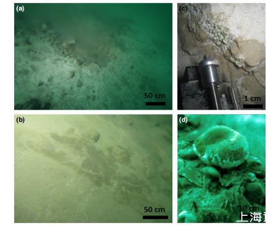 圖2、顯示水下泉水中發現的不同微生物群落的圖像。WhMat1(a)和DMat(b)覆蓋了幾平方米的沉積物,(c)WhMat2和(d)Mat4。