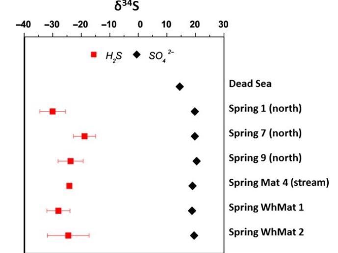 圖1、死海和純泉水樣本中硫化物和硫酸鹽的同位素組成。誤差條代表同一點的三次重復樣本之間的變化。硫酸鹽的變化很小,并包含在符號內。