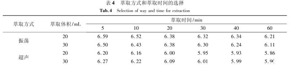 取選定的實驗用煙,在同樣的抽吸條件下得到的粒相物濾片,分別加入10,20,30,40,50 mL KCl水溶液,分別用振蕩和超聲的方式萃取30 min,測定其pH值,結果見表3.從表3的結果來看,在10——50 mL的范圍內,隨著萃取體積的增大,pH值也會增加,但增加到一定程度后變化不再明顯,根據節省試劑原則,選擇20 mL作為萃取劑萃取體積。