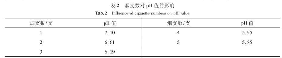 取選定的實驗用煙,分別抽吸1,2,3,4,5支卷煙,得到的劍橋濾片用20 mL KCl水溶液超聲萃取30 min,測定其pH值,結果見表2.從表2來看,對于44 mm的劍橋濾片,煙支數越多得到的pH值會越小,但4支和5支煙的區別不是很大,因此對于44 mm劍橋濾片來說,應選擇抽吸的煙支數為4支。