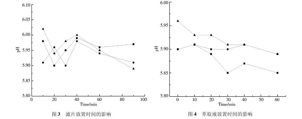 取選定的實驗用煙,在同樣的抽吸條件下得到的粒相物濾片,分別放置10,20,30,40,60,90 min后,再用20 mL KCl水溶液進行超聲萃取30 min,測定其pH值,確定濾片放置的最長時間。結果見圖3(3次實驗結果)。從圖3的結果來看,卷煙抽吸完后,pH值隨濾片放置的時間有變化但變化并不明顯,濾片可以放置長達90 min再進行萃取。
