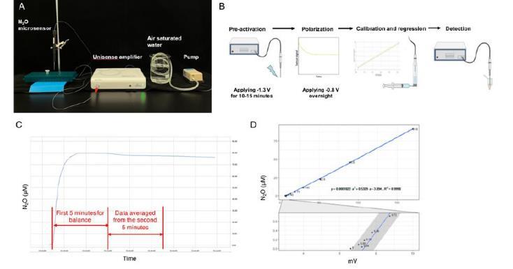 圖2、氧化亞氮微電極系統(tǒng)的工作流程示意圖。(A)建立Unisense 氧化亞氮微電極。(B)氧化亞氮微電極系統(tǒng)的啟動,包括預(yù)激活、極化、使用N2O標(biāo)準(zhǔn)溶液進(jìn)行校準(zhǔn),并構(gòu)建線性回歸以計算每個實驗的樣品濃度。(C)樣品測量需要10 min,其中前5 min用于平衡,后5 min的信號取平均值以獲得數(shù)據(jù)。(D)每次使用10次連續(xù)稀釋濃度的N2O標(biāo)準(zhǔn)溶液和0μM的水構(gòu)建線性回歸。對于低于0.1μM的濃度(根據(jù)制造商的說明的最低檢測限),將處理為0μM。