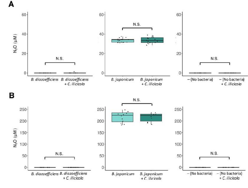 圖3、定量慢生根瘤菌屬產(chǎn)生的N2O伴/不伴Calonectria ilicicola。(A)在提供100μM KNO3的酵母甘露醇肉湯(YMB)中進(jìn)行體內(nèi)測試。(B)在提供500μM KNO的YMB中進(jìn)行體內(nèi)測試。僅對缺乏nosZ基因的日本慢生根瘤菌檢測不到N2O,而未檢測到攜帶nosZ基因的慢生根瘤菌。