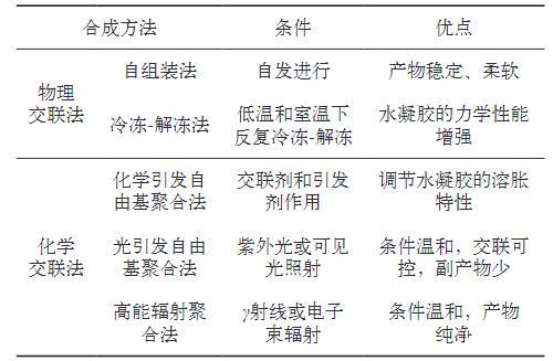 水凝膠的親水聚合物鏈通過化學或物理交聯法構成三維網絡結構,可充分吸水并維持3D層次結構。物理交聯法主要是通過非共價鍵作用形成聚合物,具有一定的可逆性,主要包括自組裝法、冷凍-解凍法等?;瘜W交聯法是通過共價鍵作用交聯形成聚合物,具有不可逆性,主要包括化學引發自由基聚合法、光引發自由基聚合法和高能輻射法等。表1為水凝膠的主要合成方法。