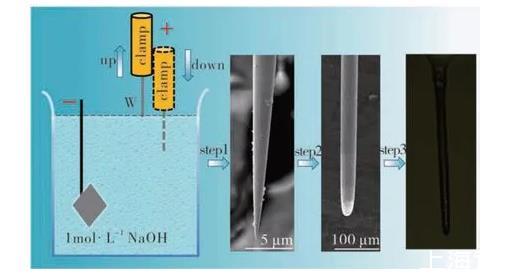 將作為陽極的鎢絲夾住并置于1 mol·L-1的NaOH溶液中,在電壓為4 V(vs.Ag/AgCl)條件下反復插入NaOH溶液內進行電化學刻蝕。由于靠近杯子底部的W絲會部分接觸溶液的時間過長,被電化學刻蝕的程度大而導致鎢絲形成錐形尖端。待W絲的刻蝕完成后,將其浸入氫氟酸溶液中10 min,以去除電化學刻蝕過程中在表面形成的氧化物。然后,在丙酮和純水中超聲清洗10 min,清洗完畢豎直將其懸掛浸入納米金剛石粉懸濁液中,利用超聲波震蕩30 min。最后,用酒精清洗1 min晾干待用。BDD微電極的制備過程示意圖如圖1所示。